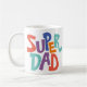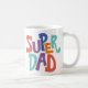 Fun t-coffee or tea mug with colorful cute simple SUPER DAD text written in a colorful stylish modern red, orange, blue, purple, and green colored typography font.