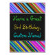 This fun, colorful and whimsical birthday-themed greeting card design features a warm birthday wish like "Have a Great 3rd Birthday, Custom-Name!" on the front. The name on the front can be personalized. The top and bottom of the front feature a vibrant, multicolored stripe pattern. The inside features a customizable birthday message. A greeting card like this could be a fun way to deliver birthday wishes to somebody who is celebrating their third birthday. [~Z0000269]