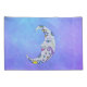 This set of pillowcases have a fun white crescent moon with a face that has pink lips and blue eyes. It is decorated with colorful festive markings in blue, yellow, and purple on a purple sky background with tiny stars.