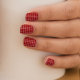 Cross hatch lines helped create this delicate pattern on this chic Minx nail art set. Do-it-yourself manicure set with a fun design in alternating colors of red and chalk white soft edged lines.