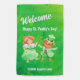 St. Patrick's Day we all pretend to be Irish and in green party mode. Welcome guests to your home with this personalized house flag that displays your address and name. Against a background of glowing shamrocks, a wee leprechaun couple dances a jig – red hair shining around their pointed ears. Their green clothing is leprechaun perfection down to their golden dancing slippers. "Welcome" slants across the top in a pale green script font. Below is "Happy St. Paddy's Day" and your address in a white sans serif font. All text is easily edited.