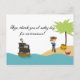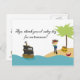 This boys birthday party thank you post card has a pirate theme. There is an island on the right with a treasure chest, a pirate boy, and a crab. On the left, there is a pirate's ship. There are two jolly roger skulls on the ship. You can easily customize your thank you message on the back. copyright 2010 JD Digi Designs