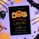 This cute Halloween party invitation features a black background, adorable pumpkin illustrations, and fun typography on the front. On the back you will find an orange and black stripe background. Further customize this design by adding a photo and/or additional text to the back!