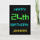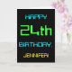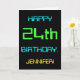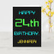 This simple and fun birthday greeting card design features a message like "HAPPY 24th BIRTHDAY, JENNIFER!". It also features a fun appearance inspired by digital computing. The name on the front and the message on the inside can be customized. It could be sent or given to somebody who is celebrating their twenty fourth birthday, and who perhaps works (or worked prior to retirement) as a computer programmer, a software developer, a database administrator, a network administrator, an electronics engineer, or who otherwise enjoys using computers. [~Z0000100]
