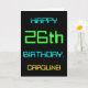 This simple and fun birthday greeting card design features a message like "HAPPY 26th BIRTHDAY, CAROLINE!". It also features a fun appearance inspired by digital computing. The name on the front and the message on the inside can be personalized. It could be sent or given to somebody who is celebrating their twenty sixth birthday, and who perhaps works (or worked prior to retirement) as a database administrator, a computer programmer, a network administrator, a software developer, an electrical engineer, or who otherwise enjoys using computers. [~Z0000100]