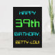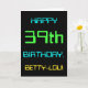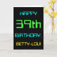 This simple and fun birthday greeting card design features a message like "HAPPY 39th BIRTHDAY, BETTY-LOU!". Its appearance is inspired by the field of digital computing. The name on the front and the message on the inside can be customized. It could be sent or given to somebody who is celebrating their thirty ninth birthday, and who perhaps works (or worked prior to retirement) as a computer programmer, a software developer, a database administrator, a network administrator, an electronics engineer, or who otherwise enjoys using computers. [~Z0000100]