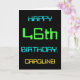This simple and fun birthday greeting card design features a message like "HAPPY 46th BIRTHDAY, CAROLINE!". It also features a fun look inspired by digital computing. The name on the front and the message on the inside can be personalized. It could be sent or given to somebody who is celebrating their forty sixth birthday, and who perhaps works (or worked prior to retirement) as a computer programmer, a software developer, a database administrator, a network administrator, an electronics engineer, or who otherwise enjoys using computers. [~Z0000100]