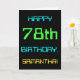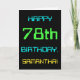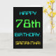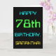 This simple and fun birthday greeting card design features a message like "HAPPY 78th BIRTHDAY, SAMANTHA!". It also features a fun appearance inspired by digital computing. The name on the front and the message on the inside can be customized. It could be sent or given to somebody who is celebrating their seventy eighth birthday, and who perhaps works (or worked prior to retirement) as a database administrator, a computer programmer, a network administrator, a software developer, an electrical engineer, or who otherwise enjoys using computers. [~Z0000100]