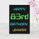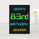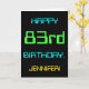 This simple and fun birthday greeting card design features a message like "HAPPY 83rd BIRTHDAY, JENNIFER!". It also features a fun look inspired by digital computing. The name on the front and the message on the inside can be personalized. It could be sent or given to somebody who is celebrating their eighty third birthday, and who perhaps works (or worked prior to retirement) as a computer system administrator, a computer programmer, a network administrator, an electrical engineer, a software developer, or who otherwise enjoys using computers. [~Z0000100]