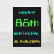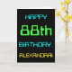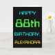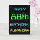 This simple and fun birthday greeting card design features a message like "HAPPY 88th BIRTHDAY, ALEXANDRA!". It also features a fun appearance inspired by digital computing. The name on the front and the message on the inside can be customized. It could be sent or given to somebody who is celebrating their eighty eighth birthday, and who perhaps works (or worked prior to retirement) as a computer programmer, a software developer, a database administrator, a network administrator, an electronics engineer, or who otherwise enjoys using computers. [~Z0000100]