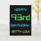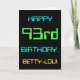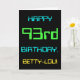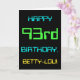 This simple and fun birthday greeting card design features a message like "HAPPY 93rd BIRTHDAY, BETTY-LOU!". It also features a fun appearance inspired by digital computing. The name on the front and the message on the inside can be customized. It could be sent or given to somebody who is celebrating their ninety third birthday, and who perhaps works (or worked prior to retirement) as a database administrator, a computer programmer, a network administrator, a software developer, an electrical engineer, or who otherwise enjoys using computers. [~Z0000100]