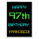 This simple and fun birthday greeting card design features a message like "HAPPY 97th BIRTHDAY, FRANCISCO!". Its appearance is inspired by the field of digital computing. The name on the front and the message on the inside can be customized. It could be sent or given to somebody who is celebrating their ninety seventh birthday, and who perhaps works (or worked prior to retirement) as a database administrator, a computer programmer, a network administrator, a software developer, an electrical engineer, or who otherwise enjoys using computers. [~Z0000100]