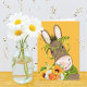 This is a fun, brightly colored, birthday card featuring an illustrated, smiling donkey wearing large round, green, sparkly glasses with the words 'HAPPY' and 'BIRTHDAY' attached to the rim. The donkey is also wearing a smart green bow tie and has a bouquet of flowers. The illustration is set against a yellow, orange background.