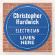 Fun Commemorative Style Wall Plaque Gift in the form of a Glass Coaster for an Electrician. Blue and white plaque. Edit the design to change the wording to suit the gift recipient.