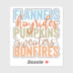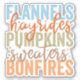 This vibrant and textured fall design highlights the quintessential elements of the autumn season with the words "Flannels," "Hayrides," "Pumpkins," "Sweaters," and "Bonfires." Each word is displayed in bold, uppercase letters, with a weathered texture that gives the design a rustic, vintage feel. The color palette includes cool blues, warm oranges, earthy greens, and soft browns, capturing the diverse colors of fall. The words "hayrides" and "sweaters" are written in a flowing, cursive script that contrasts beautifully with the blocky text, adding a touch of elegance and movement to the design. Tiny star accents are scattered around the text, adding an extra layer of charm and playfulness.