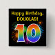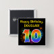 This fun, vibrant button design features a colorful bursting celebratory fireworks inspired pattern, along with the number "10" having a multicolored rainbow inspired spectrum or gradient pattern. It also features a custom name and event message, such as a "Happy Birthday" birthday greeting. A button like this might be worn by the attendees at a birthday party being held in celebration of somebody’s tenth birthday. [~Z0000334]