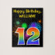 This fun, vibrant puzzle design features a colorful celebratory fireworks inspired pattern, along with the number "12" featuring a multicolored rainbow inspired gradient pattern, on a black colored background. It also features a customizable name and event message, such as a birthday greeting. A puzzle like this might be a fun way to send a birthday message to celebrate somebody’s twelfth birthday. [~Z0000329]