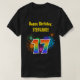 This fun, vibrant shirt design features a colorful pattern inspired by bursting celebratory fireworks, along with the number "17" featuring a multicolored rainbow like spectrum or gradient pattern. It also features a personalized name and event message, such as a "Happy Birthday" birthday greeting. A shirt like this might be worn by the attendees at a birthday party being held in celebration of somebody’s seventeenth birthday. [~Z0000332]