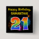 This fun, vibrant button design features a colorful bursting celebratory fireworks inspired pattern, along with the number "21" featuring a multicolored rainbow inspired spectrum or gradient pattern. It also features a customizable name and event message, such as a "Happy Birthday" birthday greeting. A button like this might be worn by the guests at a birthday party being held in celebration of somebody’s twenty first birthday. [~Z0000334]