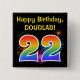 This fun, vibrant button design features a colorful pattern inspired by bursting celebratory fireworks, along with the number "22" featuring a multicolored rainbow like spectrum or gradient pattern. It also features a personalized name and event message, such as a "Happy Birthday" birthday greeting. A button like this might be worn by the guests at a birthday party being held in celebration of somebody’s twenty second birthday. [~Z0000334]