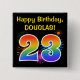 This fun, vibrant button design features a colorful pattern inspired by bursting celebratory fireworks, along with the number "23" having a multicolored rainbow like spectrum or gradient pattern. It also features a customizable name and event message, such as a "Happy Birthday" birthday greeting. A button like this might be worn by the guests at a birthday party being held to celebrate somebody’s twenty third birthday. [~Z0000334]