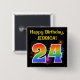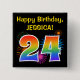 This fun, vibrant button design features a colorful pattern inspired by bursting celebratory fireworks, along with the number "24" having a multicolored rainbow inspired spectrum or gradient pattern. It also features a custom name and event message, such as a "Happy Birthday" birthday greeting. A button like this might be worn by the attendees at a birthday party being held in celebration of somebody’s twenty fourth birthday. [~Z0000334]