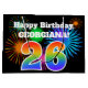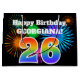 This fun, vibrant gift bag design features a colorful pattern inspired by celebratory fireworks, along with the number "26" featuring a multicolored rainbow like gradient pattern, on a black colored background. It also features a personalized name and event message, such as a birthday greeting. A colorful and joyful gift bag like this might be used when giving a gift or present to somebody who is celebrating their twenty sixth birthday. [~Z0000328]