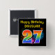 This fun, vibrant button design features a colorful pattern inspired by bursting celebratory fireworks, along with the number "27" featuring a multicolored rainbow inspired spectrum or gradient pattern. It also features a customizable name and event message, such as a "Happy Birthday" birthday greeting. A button like this might be worn by the attendees at a birthday party being held in celebration of somebody’s twenty seventh birthday. [~Z0000334]
