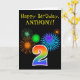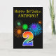 The front of this fun, vibrant birthday greeting card design features a colorful pattern inspired by celebratory fireworks, along with the number "2" having a multicolored rainbow like gradient pattern, on a black colored background. The front also features a birthday greeting message, including a customized recipient name. The inside features a customizable birthday greeting message, or could perhaps be cleared and left blank if a message is to be written by hand instead. A birthday card like this might be a fun way to send birthday wishes to somebody who is celebrating their second birthday. [~Z0000330]