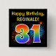 This fun, vibrant button design features a colorful bursting celebratory fireworks inspired pattern, along with the number "31" having a multicolored rainbow like spectrum or gradient pattern. It also features a custom name and event message, such as a "Happy Birthday" birthday greeting. A button like this might be worn by the attendees at a birthday party being held to celebrate somebody’s thirty first birthday. [~Z0000334]