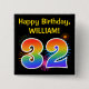 This fun, vibrant button design features a colorful pattern inspired by bursting celebratory fireworks, along with the number "32" having a multicolored rainbow inspired spectrum or gradient pattern. It also features a customizable name and event message, such as a "Happy Birthday" birthday greeting. A button like this might be worn by the attendees at a birthday party being held to celebrate somebody’s thirty second birthday. [~Z0000334]