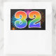 This fun, vibrant sticker design features a colorful celebratory fireworks inspired pattern, along with the number "32" featuring a multicolored rainbow like gradient pattern, on a black colored background. Stickers like this might be given as a small gift while celebrating somebody’s thirty second birthday, or perhaps for a couple’s thirty second wedding anniversary, or some other 32nd event. [~Z0000324]