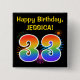This fun, vibrant button design features a colorful pattern inspired by bursting celebratory fireworks, along with the number "33" having a multicolored rainbow inspired spectrum or gradient pattern. It also features a customizable name and event message, such as a "Happy Birthday" birthday greeting. A button like this might be worn by the attendees at a birthday party being held to celebrate somebody’s thirty third birthday. [~Z0000334]