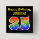 This fun, vibrant button design features a colorful pattern inspired by bursting celebratory fireworks, along with the number "35" having a multicolored rainbow inspired spectrum or gradient pattern. It also features a personalized name and event message, such as a "Happy Birthday" birthday greeting. A button like this might be worn by the attendees at a birthday party being held to celebrate somebody’s thirty fifth birthday. [~Z0000334]