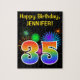 This fun, vibrant puzzle design features a colorful pattern inspired by celebratory fireworks, along with the number "35" featuring a multicolored rainbow inspired gradient pattern, on a black colored background. It also features a customizable name and event message, such as a birthday greeting. A puzzle like this might be a fun way to send a birthday message to acknowledge somebody’s thirty fifth birthday. [~Z0000329]
