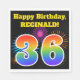 This fun, vibrant paper napkin design features a colorful pattern inspired by celebratory fireworks, along with the number "36" featuring a multicolored rainbow like gradient pattern, on a black colored background. It also features a personalized name and event message. Paper napkins like this might be used at a party being held to celebrate somebody’s thirty-sixth birthday. [~Z0000326]