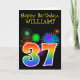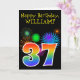 The front of this fun, vibrant birthday greeting card design features a colorful celebratory fireworks inspired pattern, along with the number "37" having a multicolored rainbow inspired gradient pattern, on a black colored background. The front also features a birthday greeting message, including a personalized recipient name. The inside features a customizable birthday greeting message, or could perhaps be cleared and left blank if a message is to be written by hand instead. A customizable birthday card like this might be a fun way to acknowledge somebody’s thirty seventh birthday. [~Z0000330]