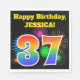 This fun, vibrant paper napkin design features a colorful celebratory fireworks inspired pattern, along with the number "37" featuring a multicolored rainbow like gradient pattern, on a black colored background. It also features a custom name and event message. Paper napkins like this could perhaps be used at a birthday party being held to celebrate somebody’s thirty seventh birthday. [~Z0000326]