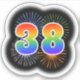 This fun, exciting sticker design features a colorful pattern inspired by bursting celebratory fireworks, along with the number "38" having a multicolored rainbow inspired spectrum or gradient pattern. A sticker like this might be fun to use when celebrating somebody’s thirty eighth birthday, or perhaps a couple’s thirty eighth wedding anniversary, or some other 38th event. [~Z0000362]