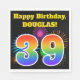 This fun, vibrant paper napkin design features a colorful celebratory fireworks inspired pattern, along with the number "39" having a multicolored rainbow inspired gradient pattern, on a black colored background. It also features a customizable name and event message. Paper napkins like this might be used at a party being held to celebrate somebody’s thirty ninth birthday. [~Z0000326]
