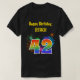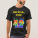 This fun, vibrant shirt design features a colorful pattern inspired by bursting celebratory fireworks, along with the number "42" having a multicolored rainbow like spectrum or gradient pattern. It also features a custom name and event message, such as a "Happy Birthday" birthday greeting. A shirt like this might be worn by the attendees at a birthday party being held to celebrate somebody’s forty second birthday. [~Z0000332]