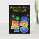 The front of this fun, vibrant birthday greeting card design features a colorful celebratory fireworks inspired pattern, along with the number "43" featuring a multicolored rainbow inspired gradient pattern, on a black colored background. The front also features a birthday greeting message, including a customizable recipient name. The inside features a customizable birthday greeting message, or could perhaps be cleared and left blank if a message is to be written by hand instead. A customizable birthday card like this might be a fun way to acknowledge somebody’s forty third birthday. [~Z0000330]