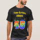This fun, vibrant shirt design features a colorful bursting celebratory fireworks inspired pattern, along with the number "45" having a multicolored rainbow like spectrum or gradient pattern. It also features a personalized name and event message, such as a "Happy Birthday" birthday greeting. A shirt like this might be worn by the guests at a birthday party being held to celebrate somebody’s forty fifth birthday. [~Z0000332]