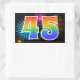 This fun, vibrant sticker design features a colorful pattern inspired by celebratory fireworks, along with the number "45" having a multicolored rainbow inspired gradient pattern, on a black colored background. Stickers like this might be used at a party celebrating somebody’s forty fifth birthday, or perhaps for a couple’s forty fifth wedding anniversary, or some other 45th event. [~Z0000324]