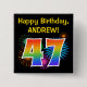 This fun, vibrant button design features a colorful pattern inspired by bursting celebratory fireworks, along with the number "47" having a multicolored rainbow inspired spectrum or gradient pattern. It also features a custom name and event message, such as a "Happy Birthday" birthday greeting. A button like this might be worn by the attendees at a birthday party being held in celebration of somebody’s forty seventh birthday. [~Z0000334]