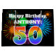This fun, vibrant gift bag design features a colorful pattern inspired by celebratory fireworks, along with the number "50" featuring a multicolored rainbow inspired gradient pattern, on a black colored background. It also features a customizable name and event message, such as a birthday greeting. A colorful gift bag like this might be used when wrapping a gift or present that is being given in celebration of somebody’s fiftieth birthday. [~Z0000328]