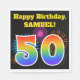 This fun, vibrant paper napkin design features a colorful celebratory fireworks inspired pattern, along with the number "50" having a multicolored rainbow like gradient pattern, on a black colored background. It also features a customizable name and event message. Paper napkins like this could perhaps be used at a party being held to celebrate somebody’s fiftieth birthday. [~Z0000326]