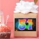This fun, vibrant sticker design features a colorful pattern inspired by celebratory fireworks, along with the number "51" having a multicolored rainbow like gradient pattern, on a black colored background. Stickers like this could perhaps be used at a party celebrating somebody’s fifty first birthday, or perhaps for a couple’s fifty first wedding anniversary, or some other 51st event. [~Z0000324]