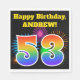 This fun, vibrant paper napkin design features a colorful pattern inspired by celebratory fireworks, along with the number "53" featuring a multicolored rainbow like gradient pattern, on a black colored background. It also features a custom name and event message. Paper napkins like this could perhaps be used at a birthday party being held to celebrate somebody’s fifty third birthday. [~Z0000326]