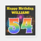 This fun, vibrant paper napkin design features a colorful pattern inspired by celebratory fireworks, along with the number "54" featuring a multicolored rainbow inspired gradient pattern, on a black colored background. It also features a customizable name and event message. Paper napkins like this might be used at a party being held to celebrate somebody’s fifty fourth birthday. [~Z0000326]